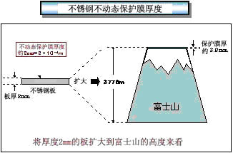 不銹鋼的表面受穩定的,薄薄的保護膜覆蓋保護,以防止內部生銹。形成該穩定的保護膜的元素是Cr(鉻)。Cr與空氣中的氧和水分反應后,形成氫化物~氧化物。該保護膜在鋼表面上形成后,內部就不生銹。將該狀態稱為鈍態,將該膜稱為鈍態保護膜。由于該鈍態保護膜極薄(1~3nm),所以肉眼不能看見。為了形成鈍態保護膜,Cr必須占有11%以上。因此,將不銹鋼稱為添加了11%以上Cr的鐵基合金。下圖表示有關鈍態保護膜厚度的概念。